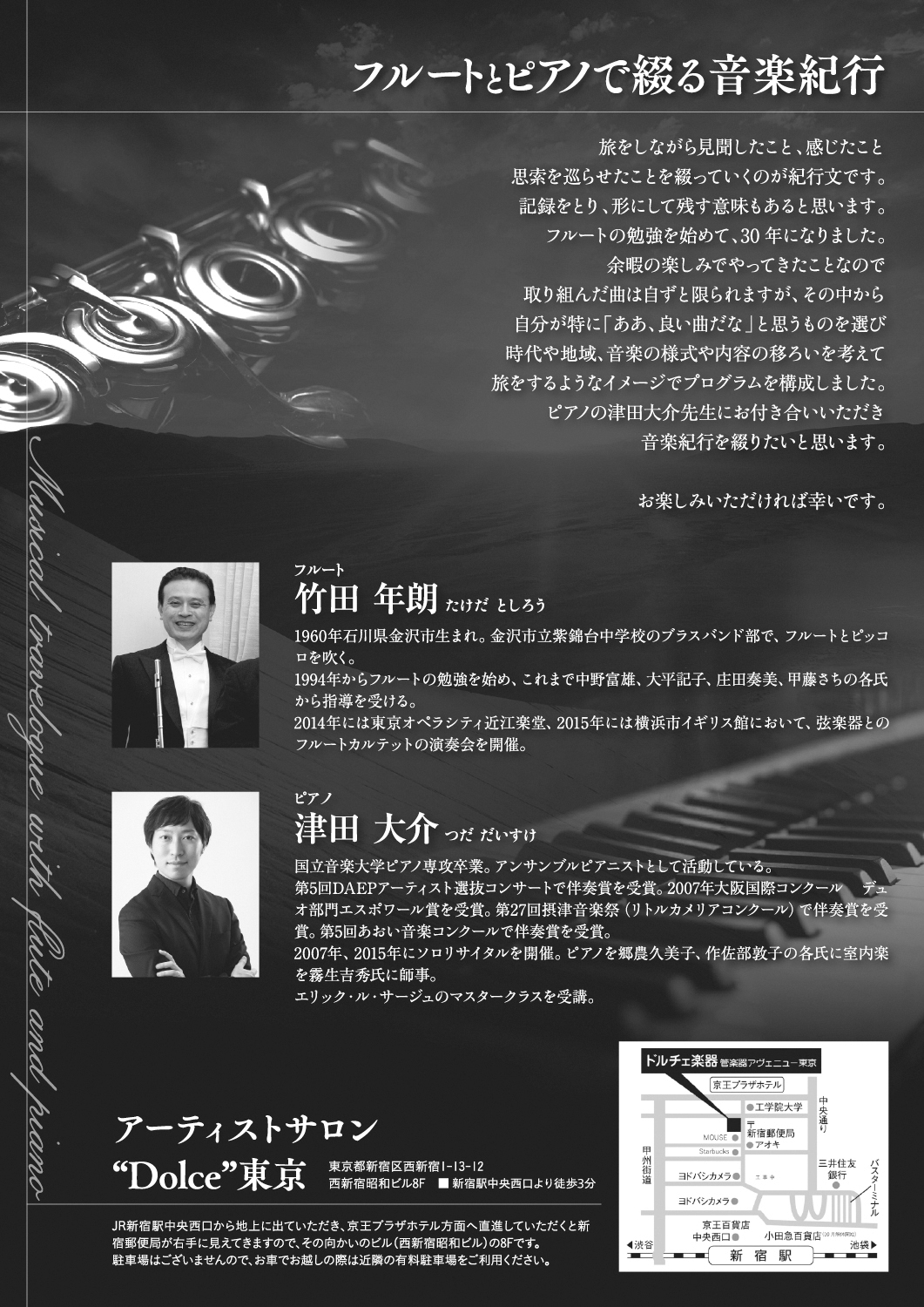今回は、フルート奏者の竹田年朗さんとピアニストの津田大介さんによる、「フルートとピアノで綴る 音楽紀行 第1話」のチラシデザインを担当させていただきました。