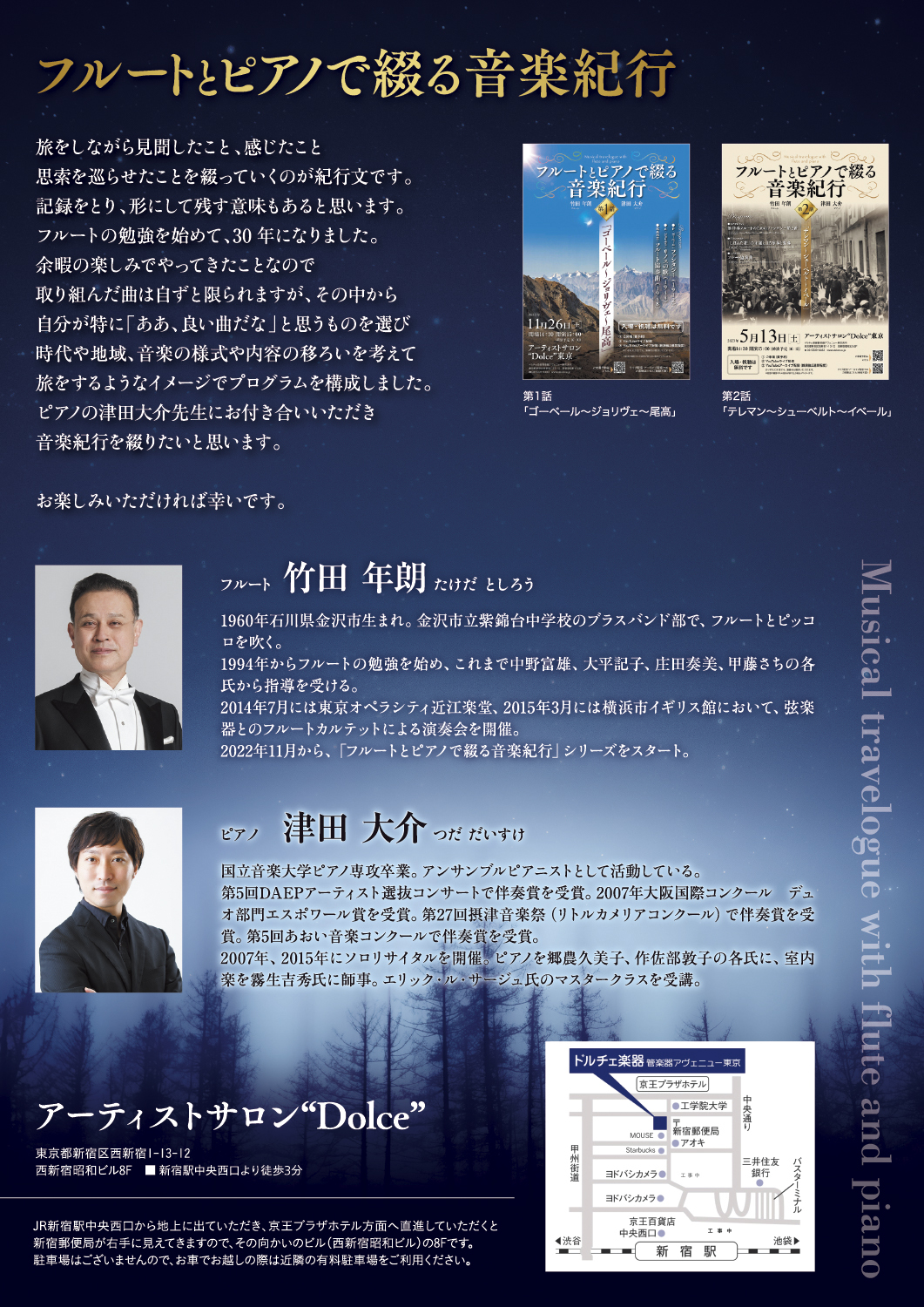 今回は、フルート奏者の竹田年朗氏とピアニストの津田大介氏による人気シリーズ「フルートとピアノで綴る音楽紀行」の第3回公演チラシを制作させていただきました。