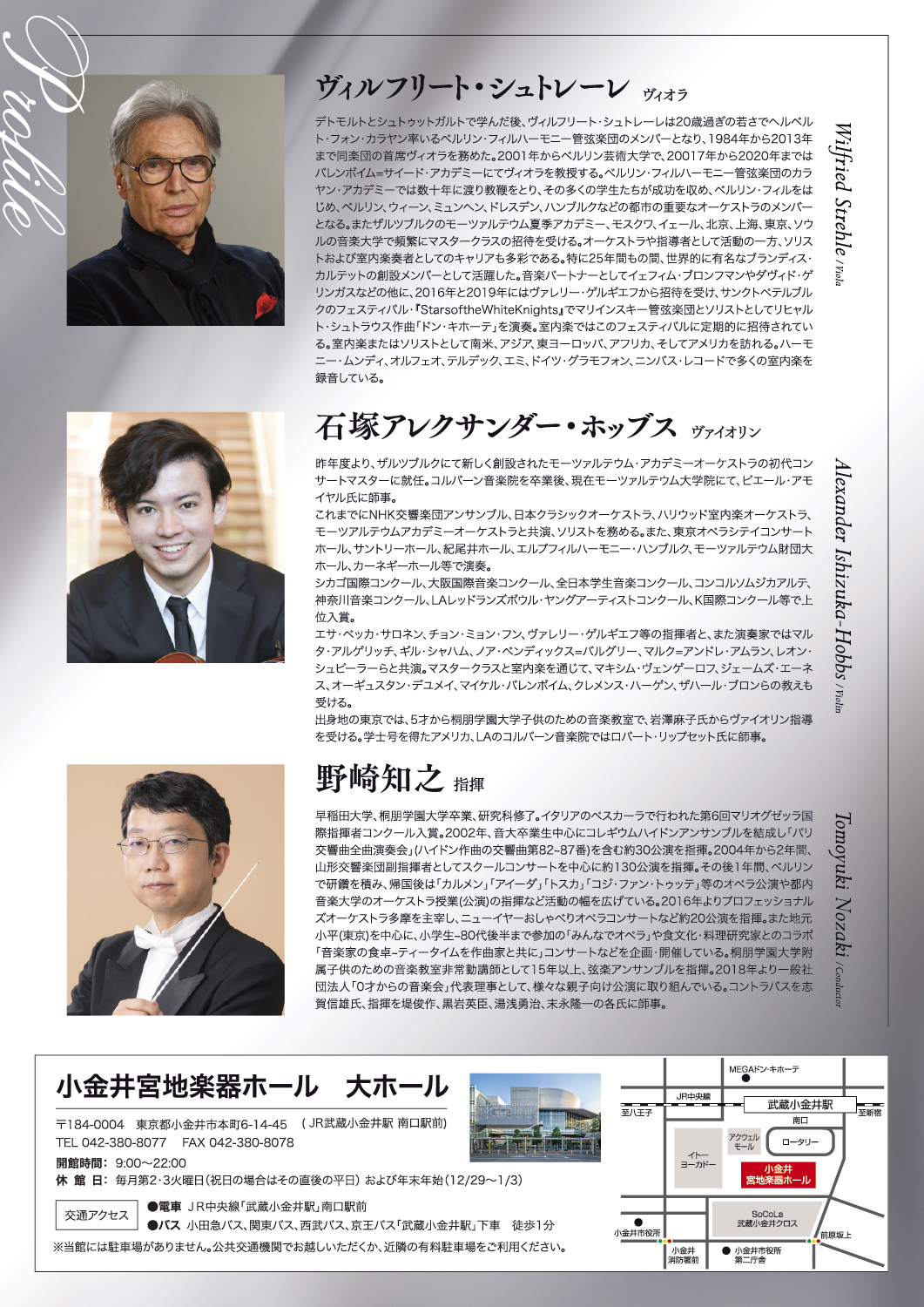 今回は、世界的ヴィオラ奏者ヴィルフリート・シュトレーレ氏を迎え、新進気鋭の若手ヴァイオリニスト石塚アレクサンダー・ホッブス氏、そして指揮の野崎知之氏が共演する「モーツァルト 伝統の系譜」のフライヤーデザインを制作させていただきました。