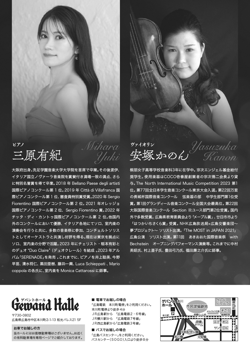 今回は、ピアニストの三原有紀さんと、ヴァイオリニストの安塚かのんさんによる、深いメッセージ性を秘めた演奏会チラシを制作させていただきました。