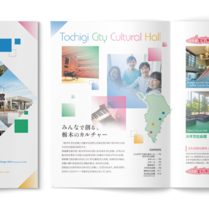 ポップなロゴが印象的な市民文化施設のパンフレットデザインであったため、そのロゴのイメージを膨らませるようなデザインでパンフレットを作成しました。イメージカラーであるイエローを全編通して使用し、3本の川が流れるイメージにつながるようなグリッドの分け方や波紋のイメージなどを織り交ぜて全体的な世界観を作成しています。